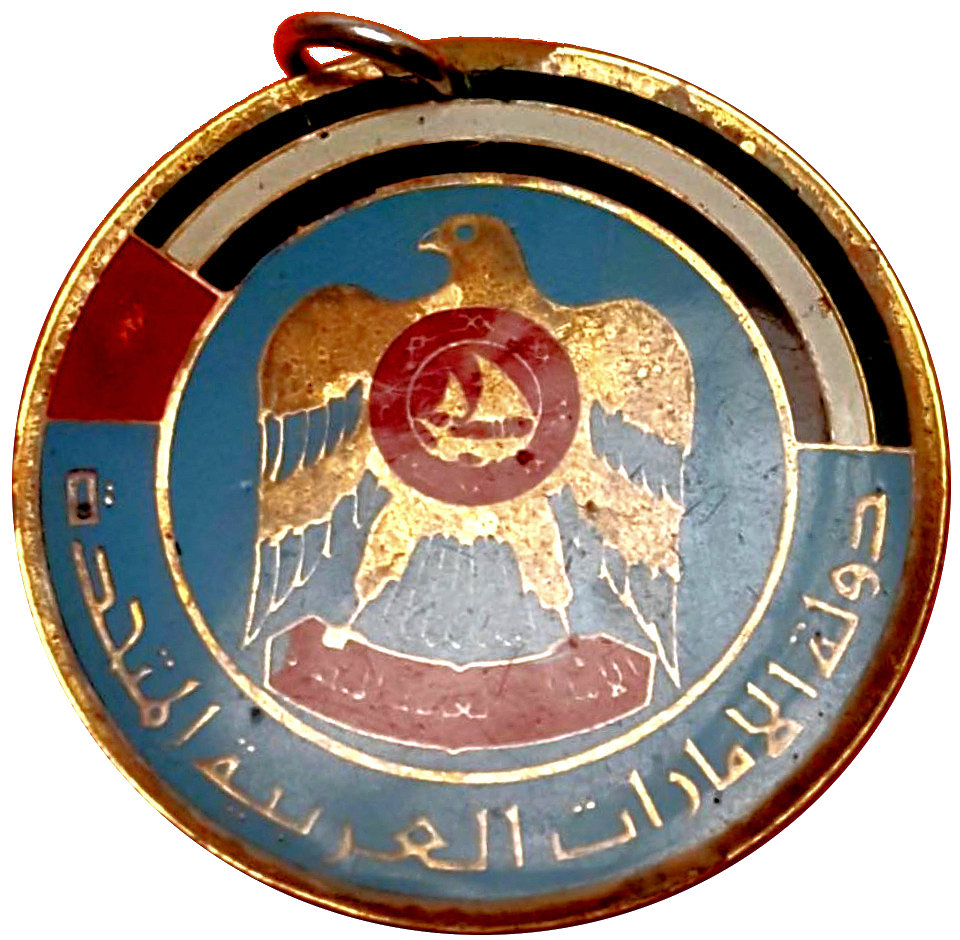 Опис: Стара емблема Об'єднаних Арабських Еміратів у колі, назва держави внизу та прапор вгорі. Емблема складається з сокола Саладіна. Сокіл тримає диск, на якому зображено арабський вітрильник. Диск оточений ланцюгом. Сокіл тримає в пазурах пергамент з назвою федерації, написаною куфічним шрифтом.
