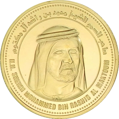 Опис: Голова шейха Мохаммеда бін Рашида Аль Мактума, звернена вправо, оточена колом, а його ім'я написано арабською мовою зверху та англійською мовою знизу.