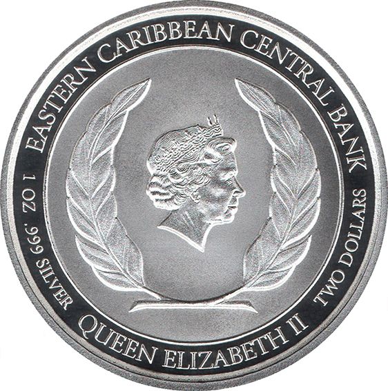 Опис: У внутрішньому колі зображено коронований портрет Її Величності Королеви Єлизавети II праворуч, в оточенні вінка, а нижче вказано вагу та пробу.