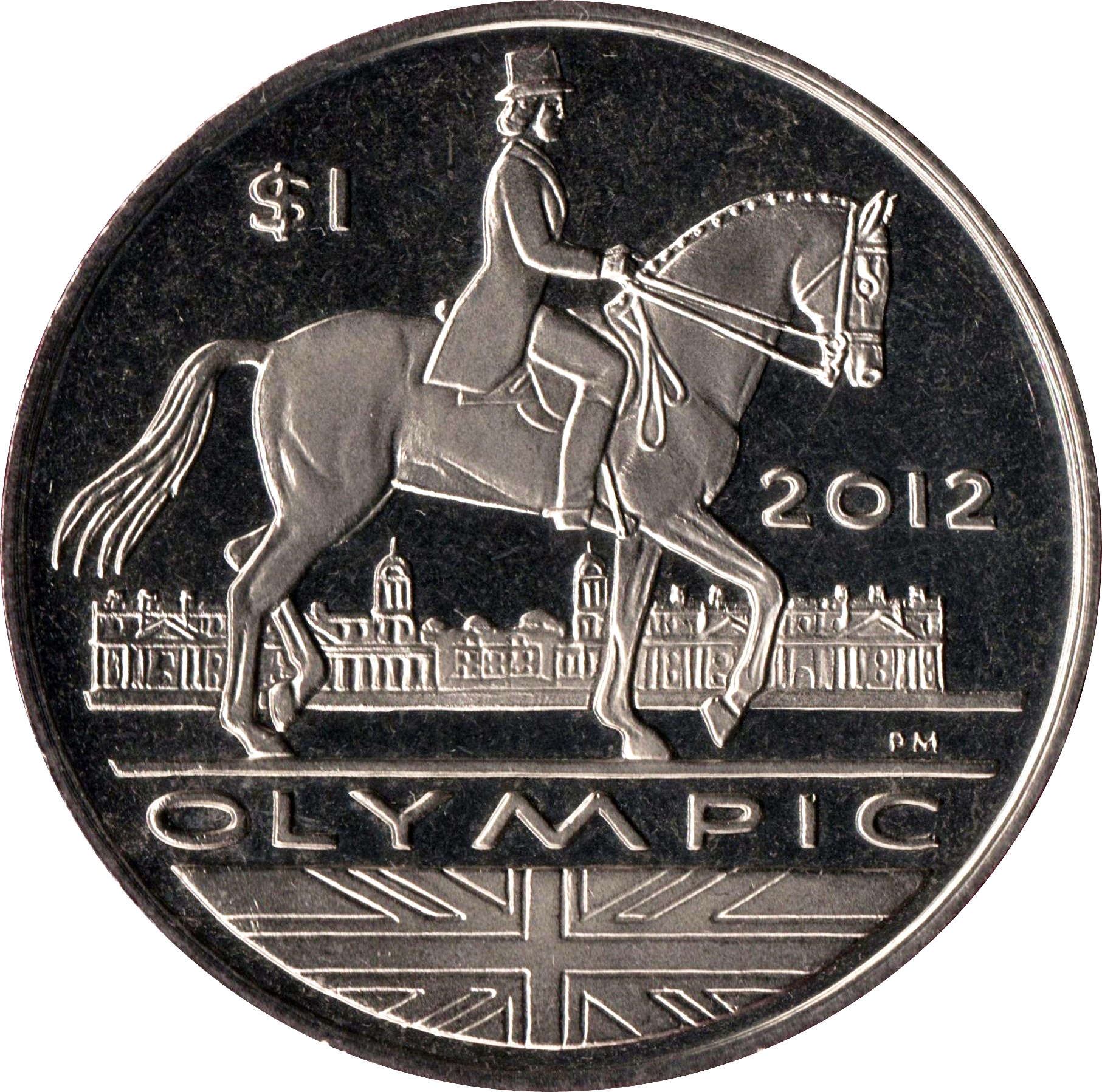 Опис: Вершник, який бере участь у змаганнях з виїздки, на тлі Старого Королівського військово-морського коледжу в Грінвічі, до якого входить Національний морський музей, а нижче — прапор Великої Британії.