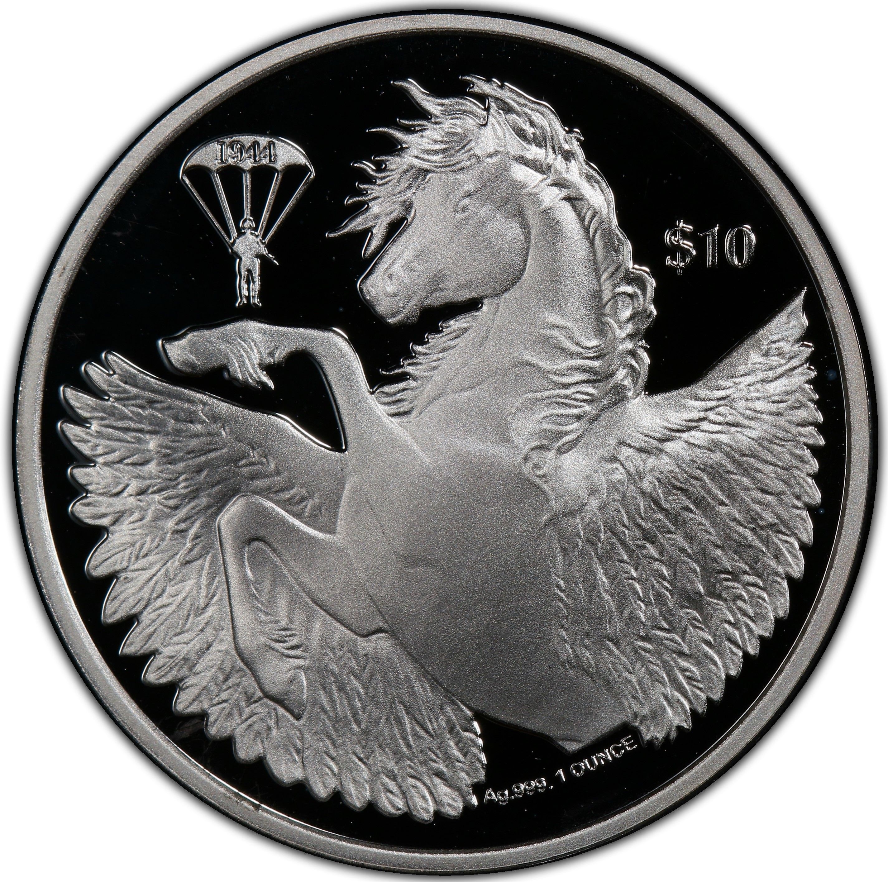 Опис: На монеті зображено міфічного коня Пегаса, що піднімається на диби з розпростертими крилами, а в лівому верхньому куті — невеликий знак парашутиста.