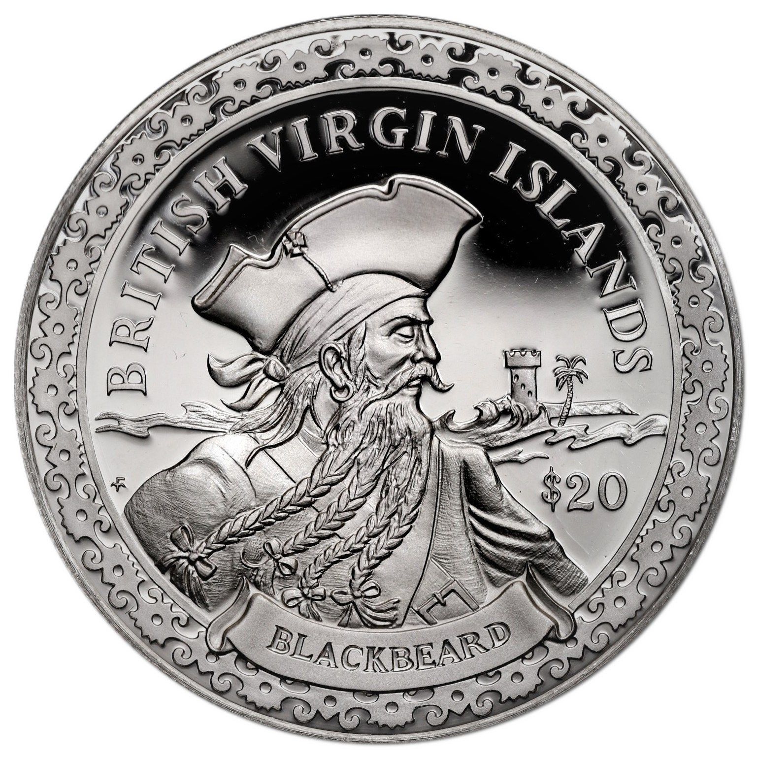 Опис: Бюст пірата Чорнобородого з вежею та пальмою на острові на задньому плані; номінал оточений візерунком