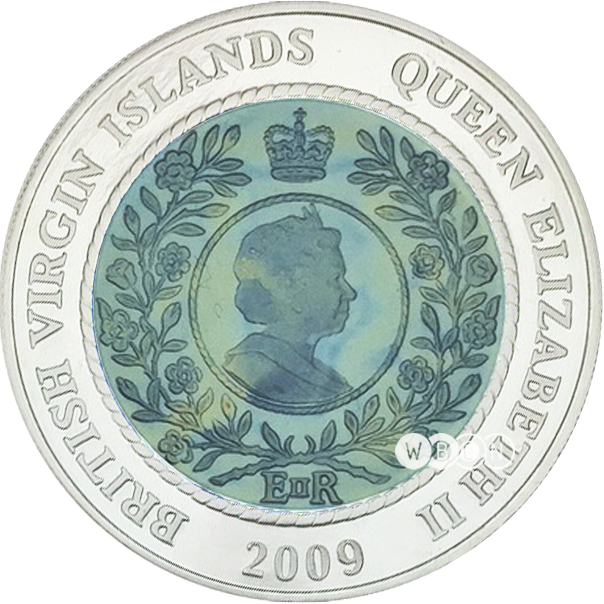 Опис: Портрет королеви з короною, монограмою та квітами у центрі; назва країни та рік випуску на обідку.