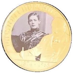 Опис: На монеті зображено класичний портрет Черчилля, який сидить за столом і тримає ручку. На фотографії Черчилль зображений у 1895 році в якості 2-го лейтенанта Королівського гусарського полку.
