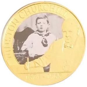 Опис: На монеті зображено класичний портрет Черчилля, який сидить за столом і тримає ручку. На фотографії Черчилль зображений у дитинстві.