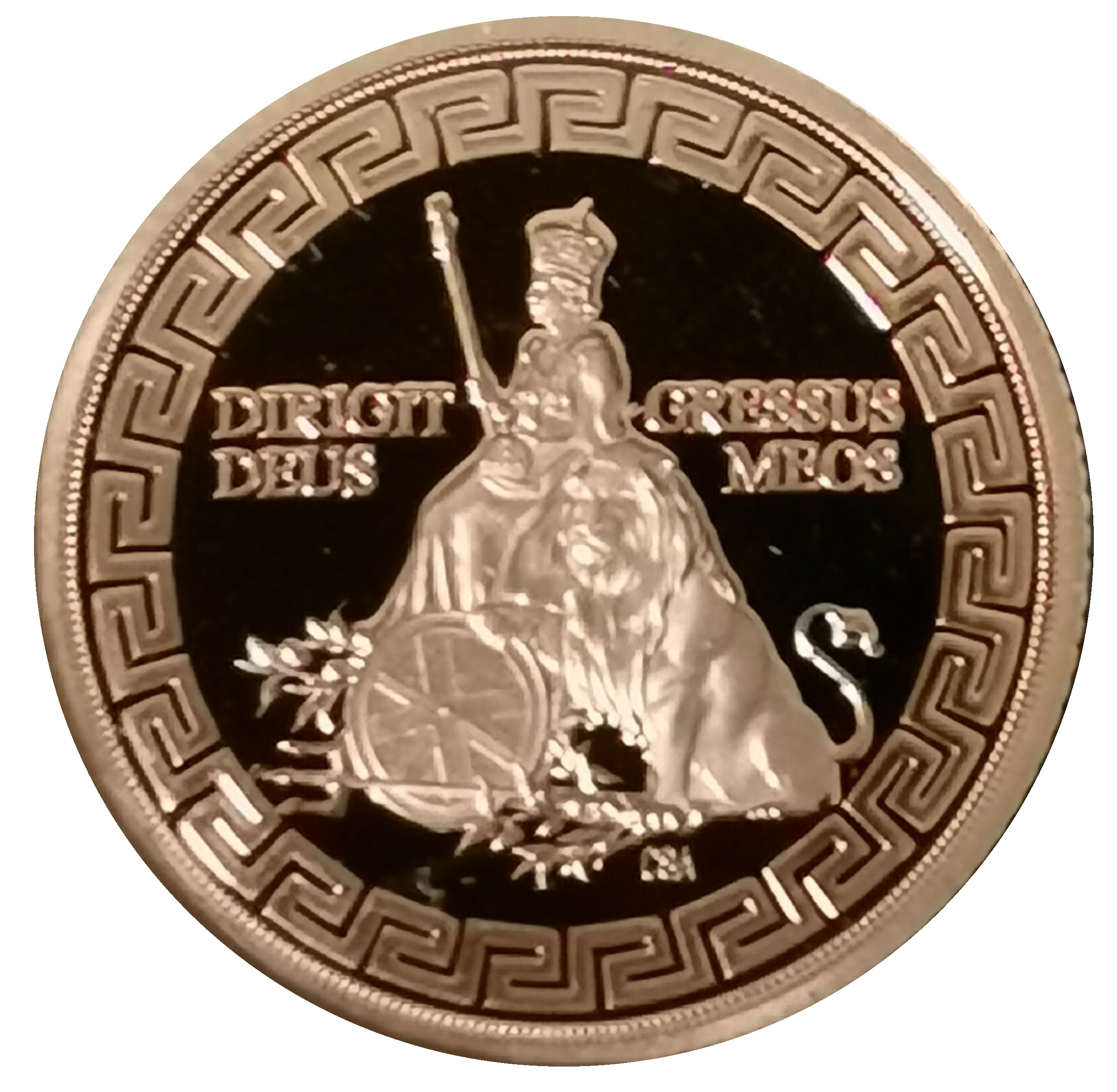 Опис: На монеті зображено короновану королеву Єлизавету II, зображення якої базується на фотографії з її коронації в 1953 році, поруч із її захисником і супутником — левом.