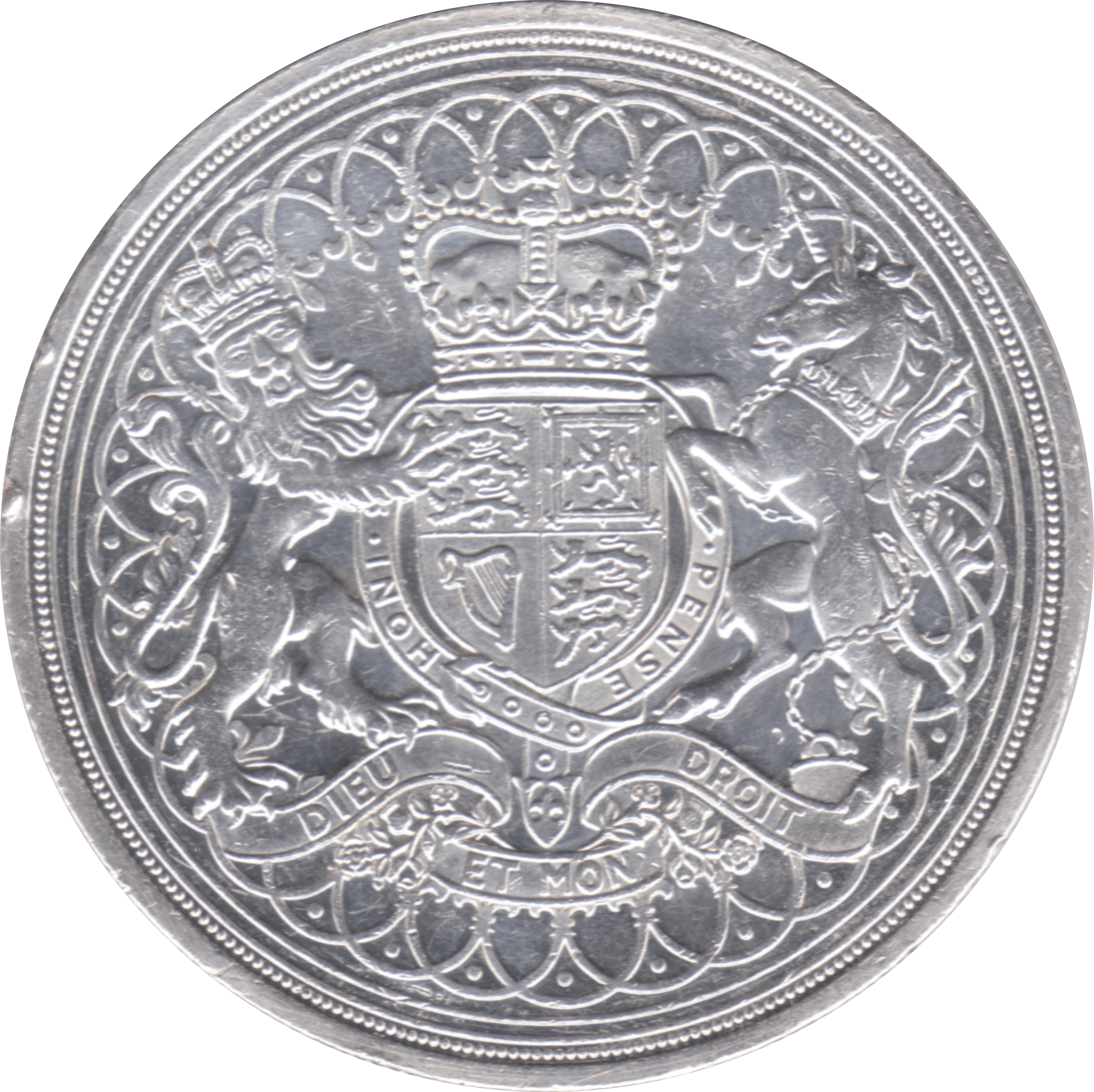 Опис: Королівський герб із коронованим щитом, розділеним на чотири частини, у центрі. Щит підтримують коронований англійський лев зліва та шотландський єдиноріг справа.