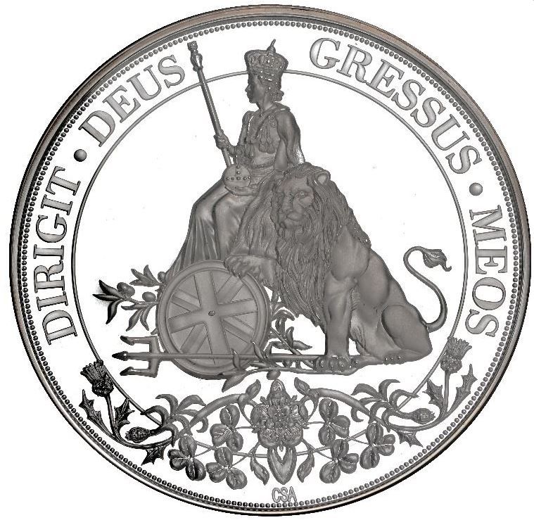 Опис: Коронована королева Єлизавета II стоїть поруч зі своїм левом, навколо квітковий мотив.