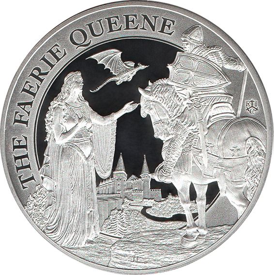 Опис: Лицар Червоного Хреста та Королева Фей від імені Леді Уни. На задньому плані дракон летить над вежами та стінами замку.