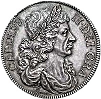 Опис: Лауреат і драпірований бюст короля Карла II праворуч, навколо напис.