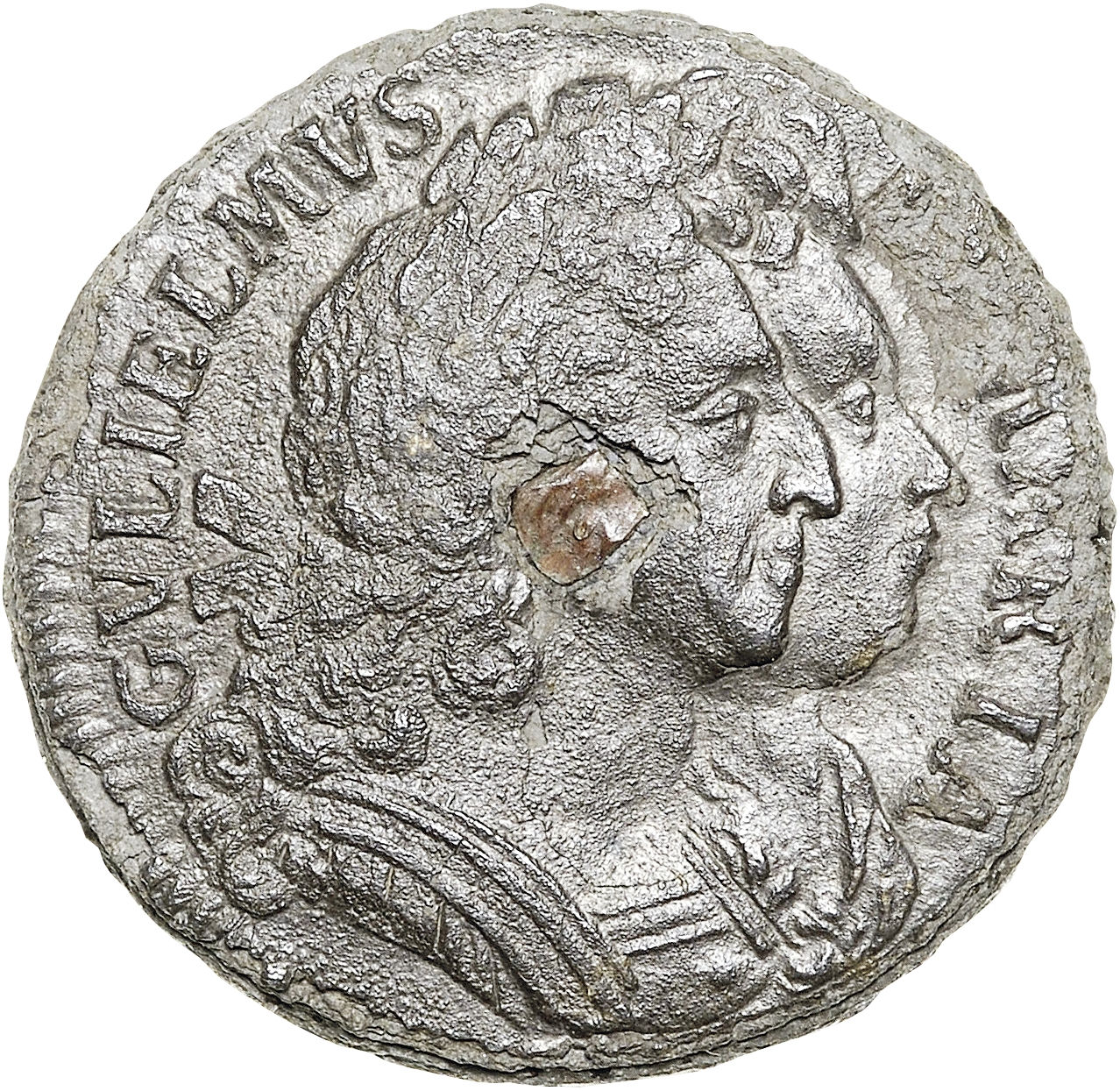Опис: Великі з'єднані бюсти короля Вільяма та королеви Марії в обладунках, звернені вправо, з написом навколо.