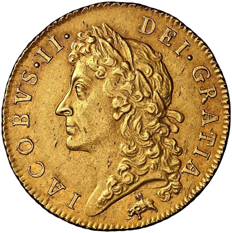 Опис: Перший лавровий бюст короля Якова II ліворуч, навколо напис. Примітка: слон і замок внизу.