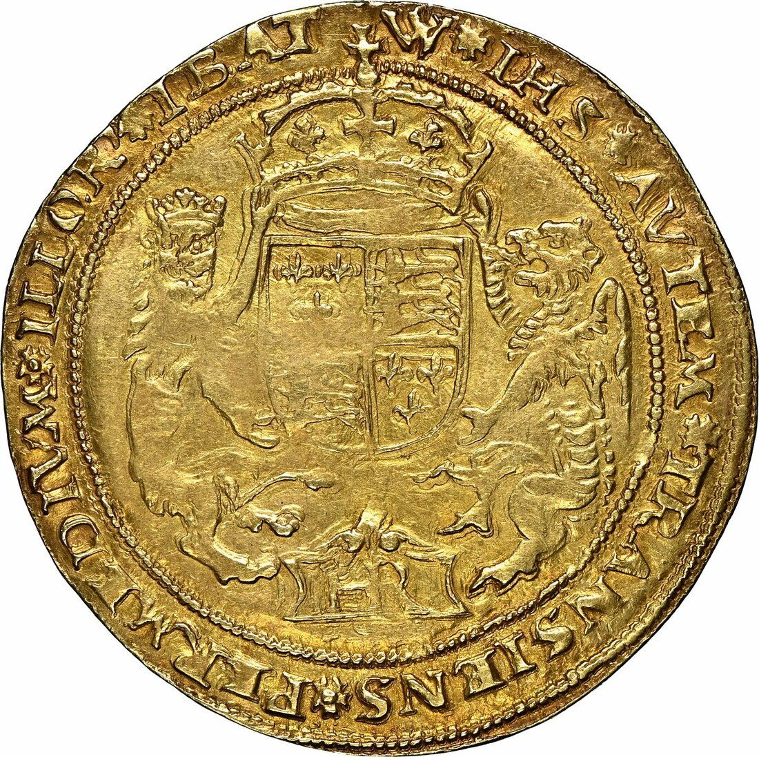 Опис: Зрілий портрет короля в стилі Гольбейна, який тримає державу і скіпетр, сидячи на прикрашеному троні з дуже тонкою решіткою і підкладкою з гранул, оточений колонами, нижче — троянда Тюдорів.