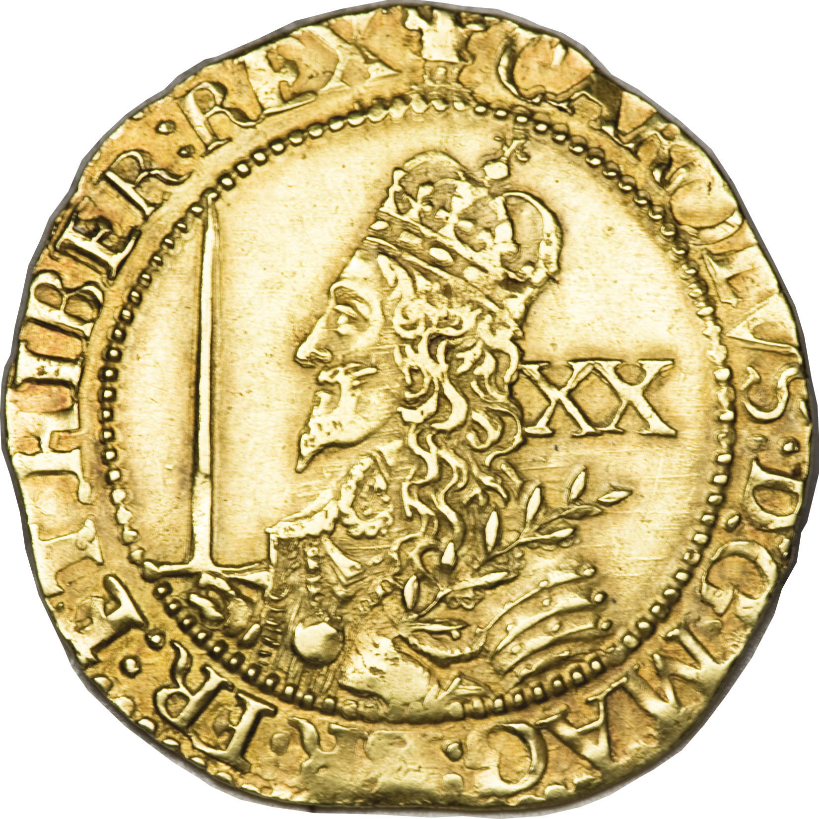 Опис: Короткий портрет короля Карла I в короні, що тримає меч, ліворуч, номінал після