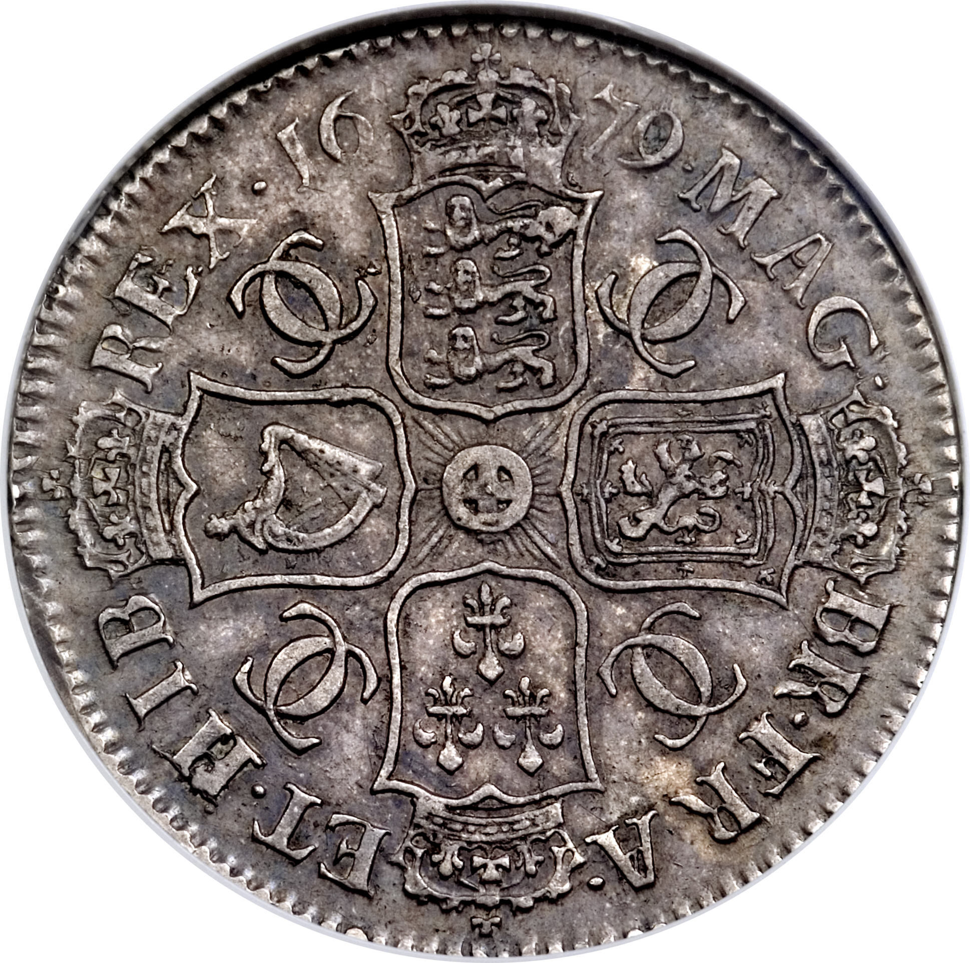 Опис: Четвертий лауреат і драпірований бюст короля Карла II праворуч, навколо — легенда.