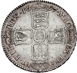 ½ крона — Вільгельм III (1-й бюст; великі щити, звичайна арфа) 1696 – 1697 Англія