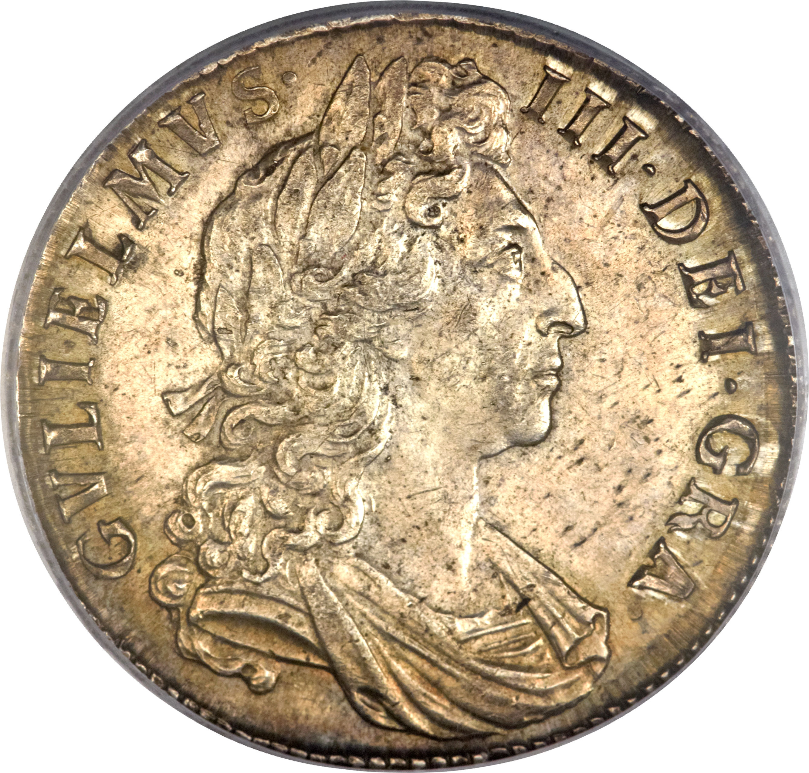 Опис: Перший лауреат і драпірований бюст короля Вільяма III праворуч, навколо напис.
