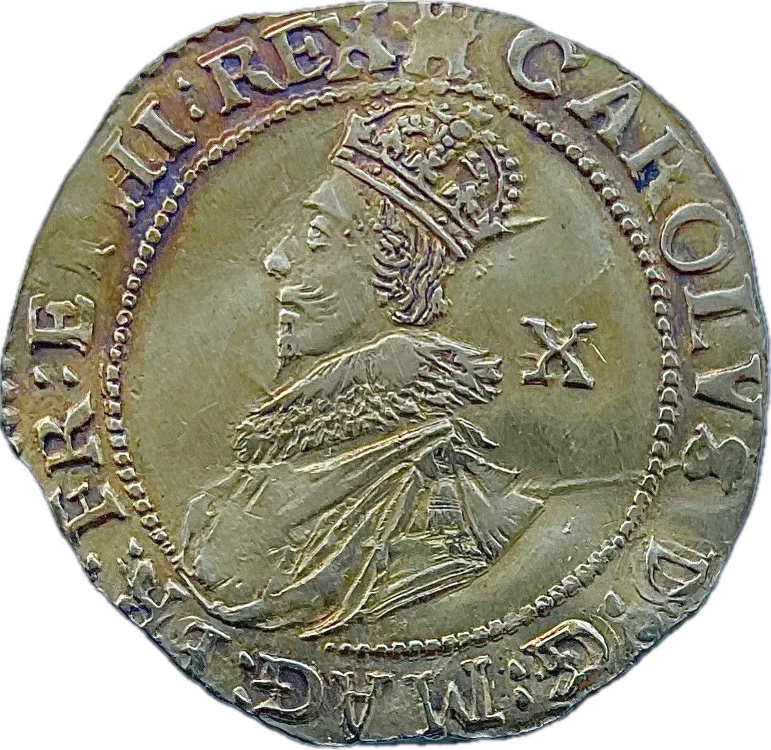 Опис: Другий бюст короля Карла, звернений вліво, в комірі, обладунках і плащі. X позаду. Номінал позаду бюста.