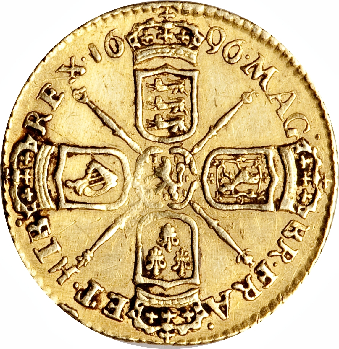 Опис: Праворуч — лавровий бюст короля Вільяма III, навколо — напис, внизу — слон і замок.