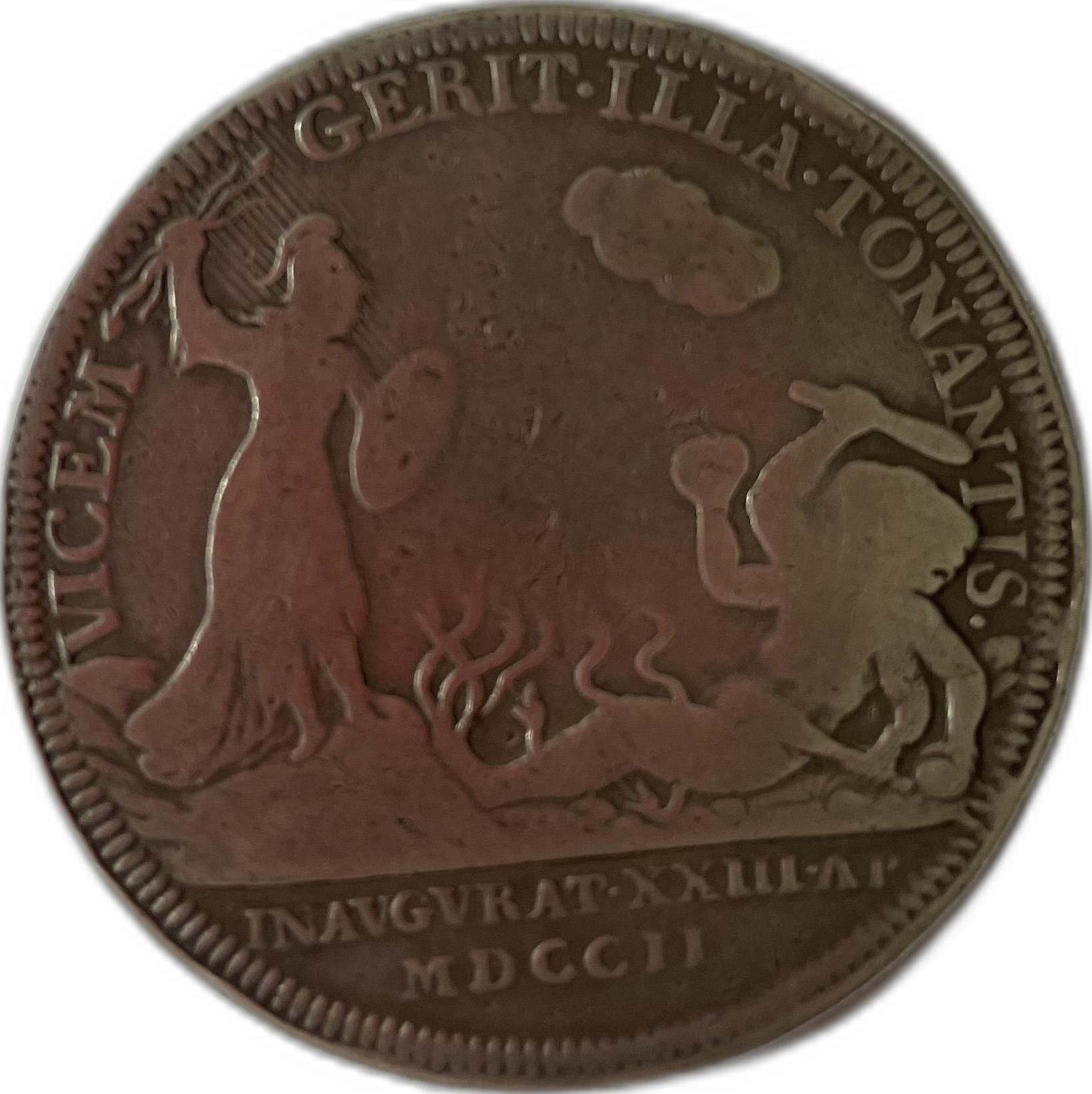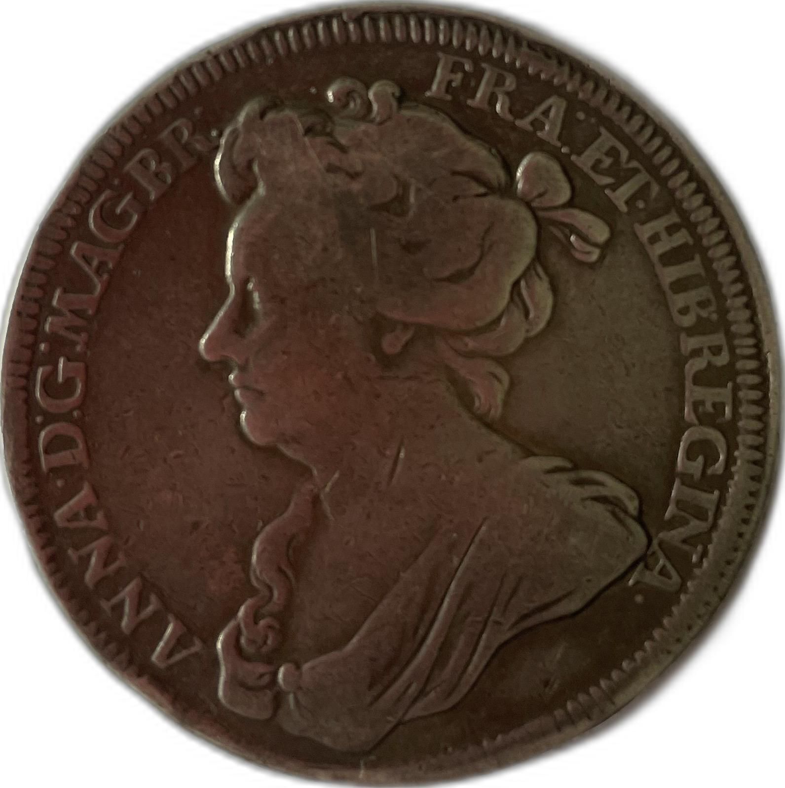 Опис: Королева Анна зображена як богиня Паллада Афіна в обладунках і зі щитом, яка тримає в руці блискавку і протистоїть лежачій монструозній фігурі з двома головами, чотирма руками та ногами, що закінчуються численними зміїними головами, яка загрожує богині палицями та камінням.