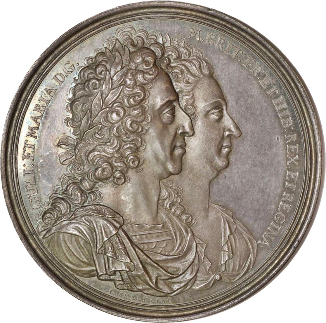 Опис: З'єднані бюсти, праворуч, Вільгельма III та Марії II, обидва у лавровому вінку. Він, з досить довгим волоссям, одягнений у лусковий обладунок та вишитий плащ; вона — у драпірованому вбранні, з брошкою спереду.