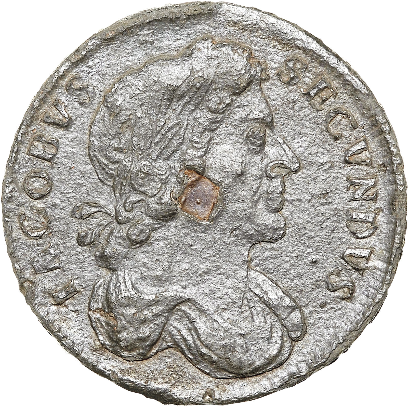 Опис: Лауреат і драпірований бюст короля Якова II праворуч, навколо напис.