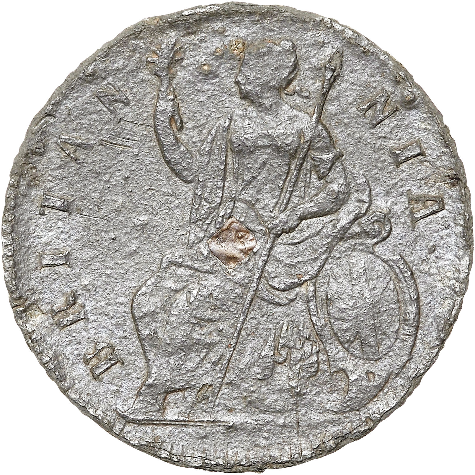 Опис: Сидяча фігура Британії ліворуч, тризуб у лівій руці, оливкова гілка в правій, щит з прапором Союзу, що спирається на ліву руку, напис навколо. ПРИМІТКА: Існують різні варіанти.