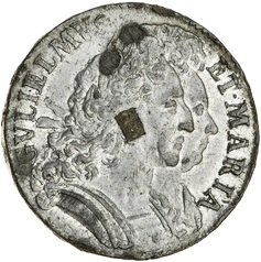 Опис: Великі лаврові та обладунки з'єднані бюсти короля Вільяма та королеви Марії праворуч, навколо напис.