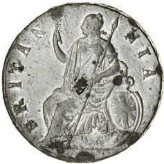 Опис: Сидяча фігура Британії ліворуч з оливковою гілкою в піднятій правій руці, списом у лівій, щитом з прапором Союзу, що лежить ліворуч, та написом навколо.