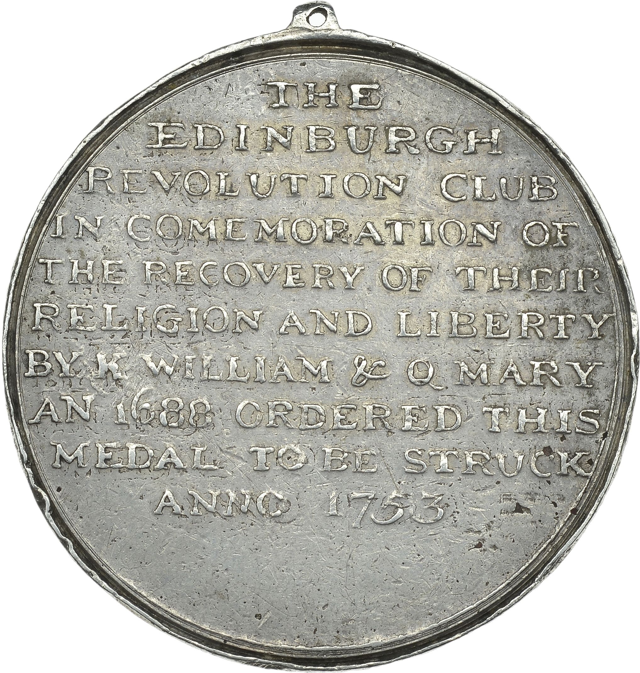 THE EDINBURGH REVOLUTION CLUB IN COMEMORATION OF THE RECOVERY OF THEIR RELIGION AND LIBERTY BY . K . WILLIAM & Q . MARY AN 1688 ORDERED THIS MEDAL TO BE STRUCK . ANNO . 1753.