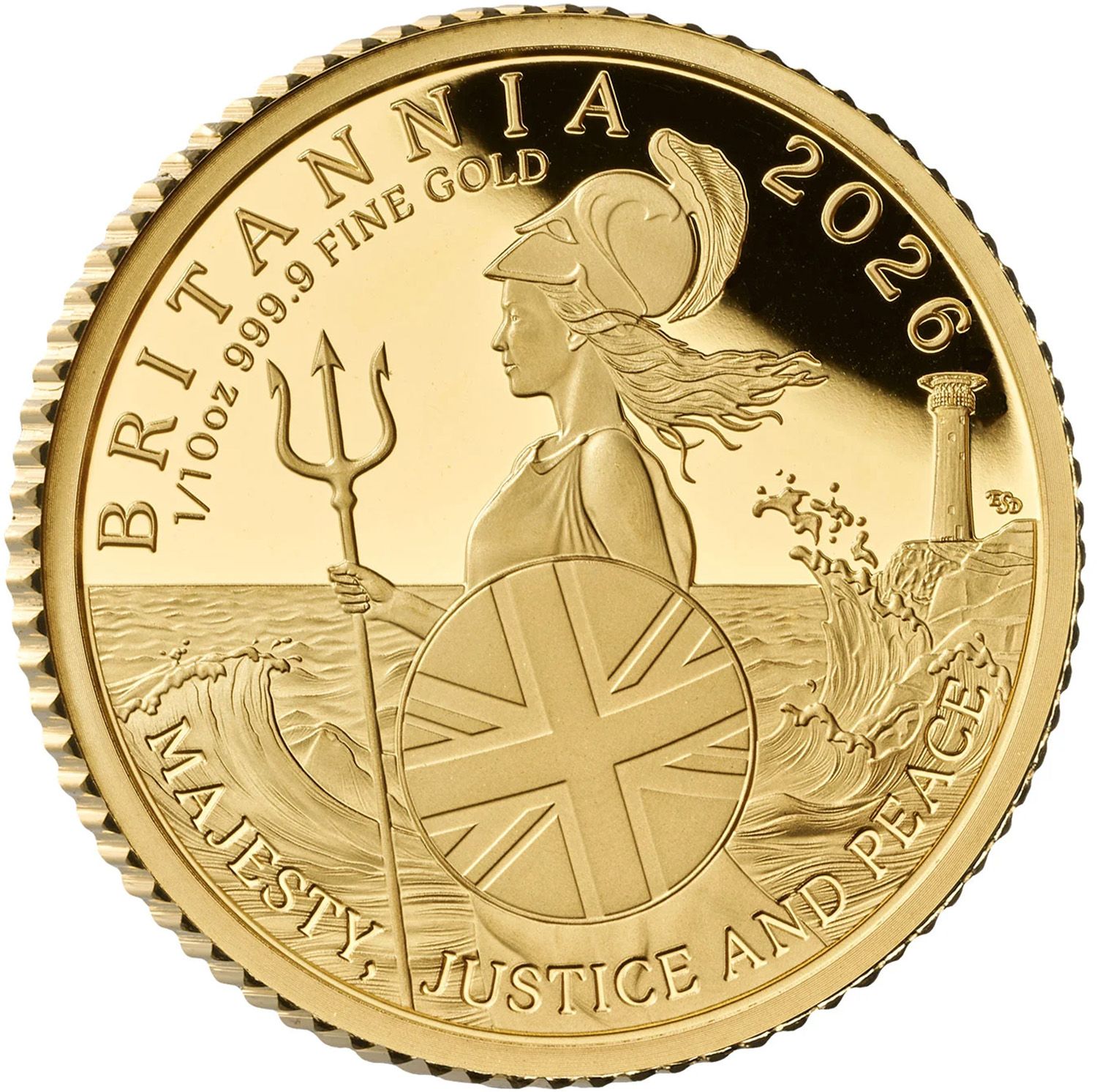Опис: Зображення Британії, що дивиться ліворуч у бік моря, тримаючи тризуб і щит із прапором Сполученого Королівства. Позаду — море та маяк.