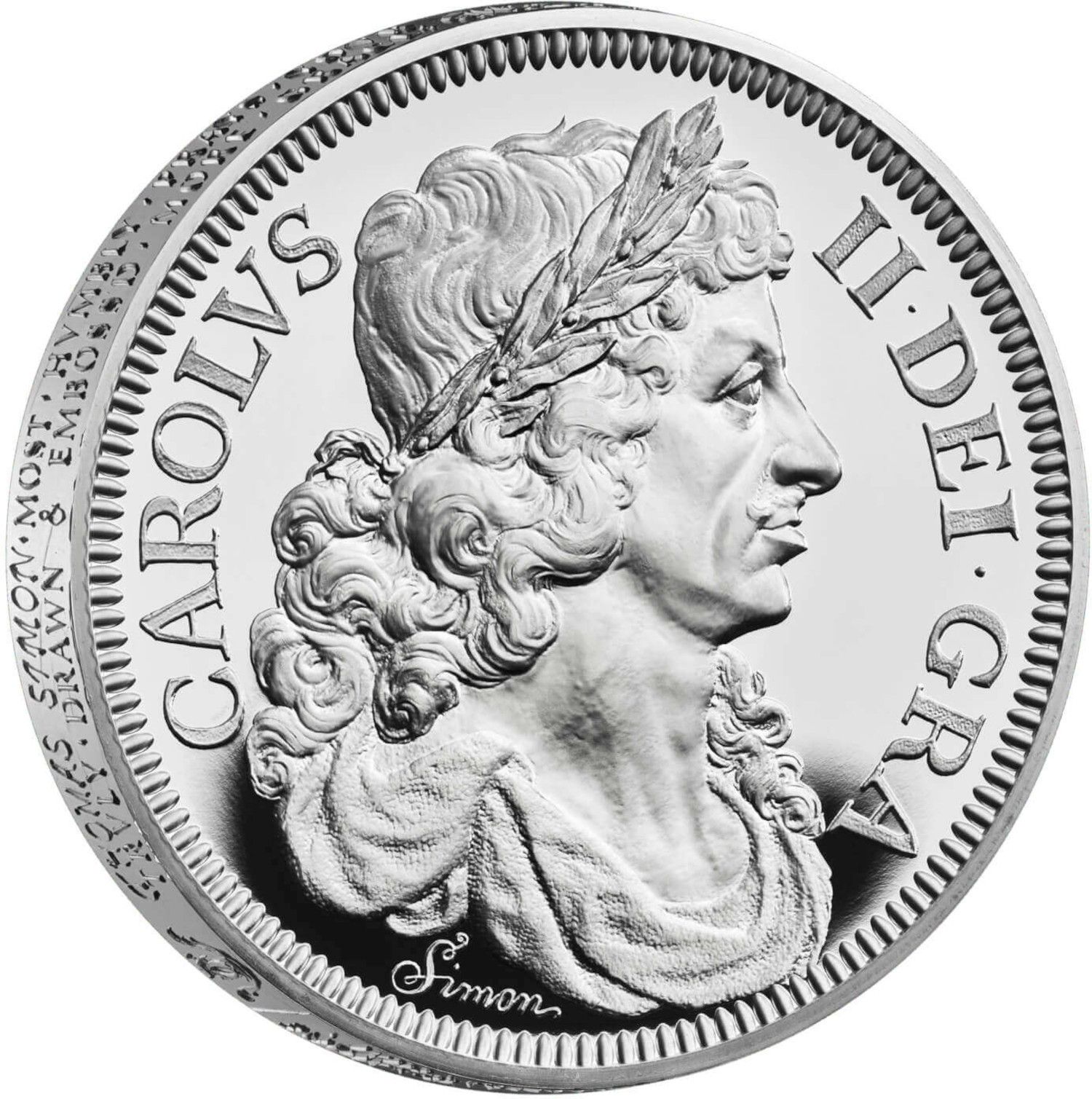 Гурт: Проста з подвійною смугою рельєфного напису. (THOMAS SIMON · MOST · HVMBLY · PRAYS · YOVR MAJESTY TO · COMPARE · THIS· HIS · TRYALL · PIECE · WITH · THE · DVTCH · AND · IF · MORE TRVLY · DRAWN & EMBOSS'D · MORE · GRACE: FVLLY · ORDER'D · AND · MORE · ACCVRATELY · ENGRAVEN · TO · RELEIVE · HIM·)