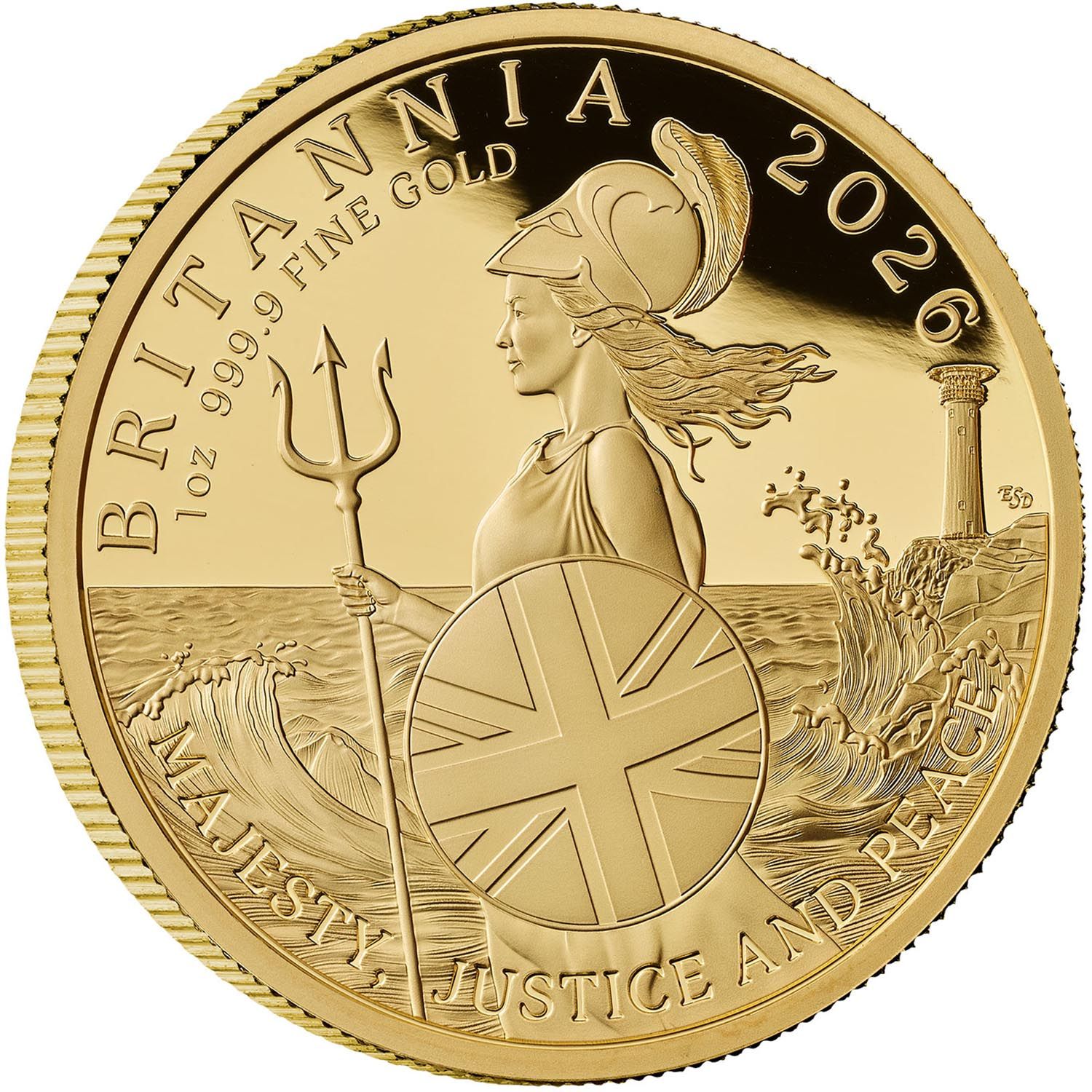 Опис: Зображення Британії, що дивиться ліворуч у бік моря, тримаючи тризуб і щит із прапором Сполученого Королівства. Позаду — море та маяк.
