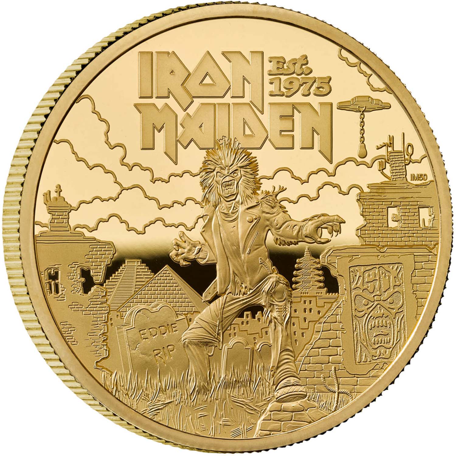 Опис: Зображення культового персонажа Iron Maiden «Едді» з надгробком, пірамідами та руїнами, супроводжуване написом