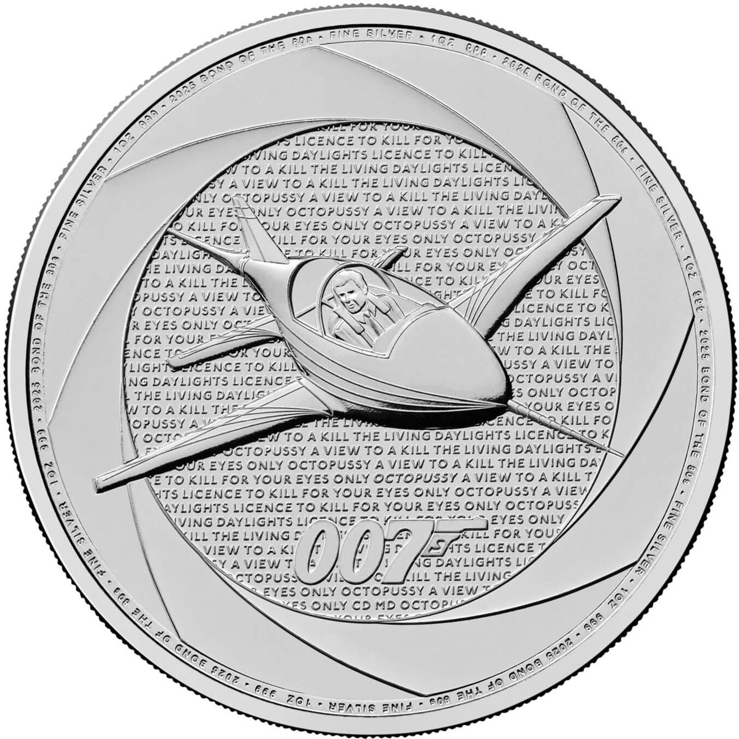 Опис: Зображення літака Джеймса Бонда з фільму «Октопуссі» на тлі титрів фільмів про Джеймса Бонда 1980-х років та напису «007». Навколо — мікротекстовий підпис.