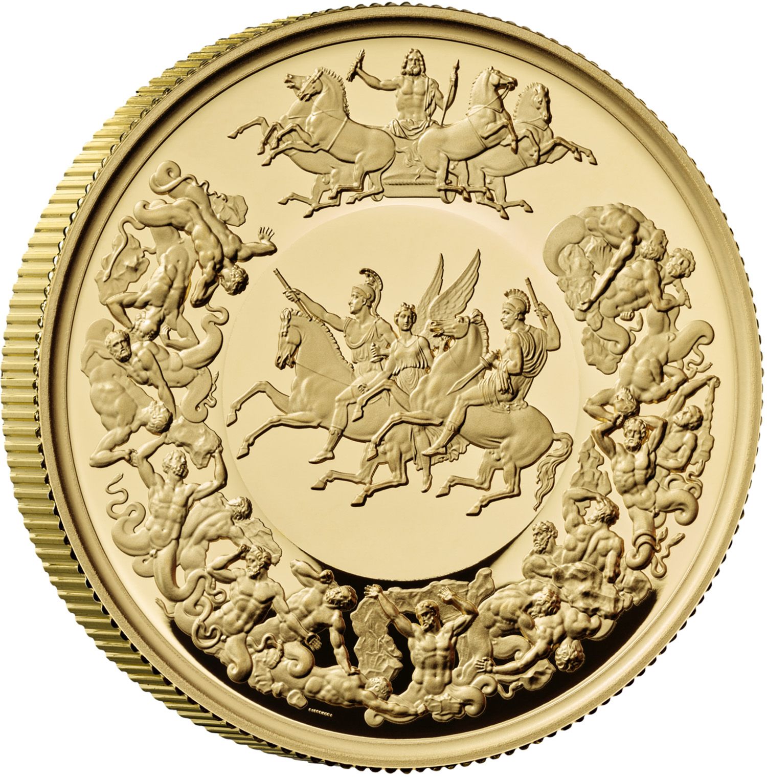 Опис: Зображення герцога Веллінгтона та прусського полководця Герхарда фон Блюхера, представлених у вигляді двох вершників у супроводі Ніки, богині перемоги, та колісниці Зевса, оточених фігурами чоловіків із зміїними ногами