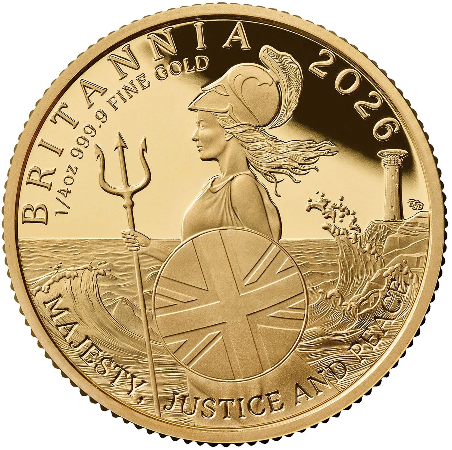 Опис: Зображення Британії, що дивиться ліворуч у бік моря, тримаючи тризуб і щит із прапором Сполученого Королівства. Позаду — море та маяк.