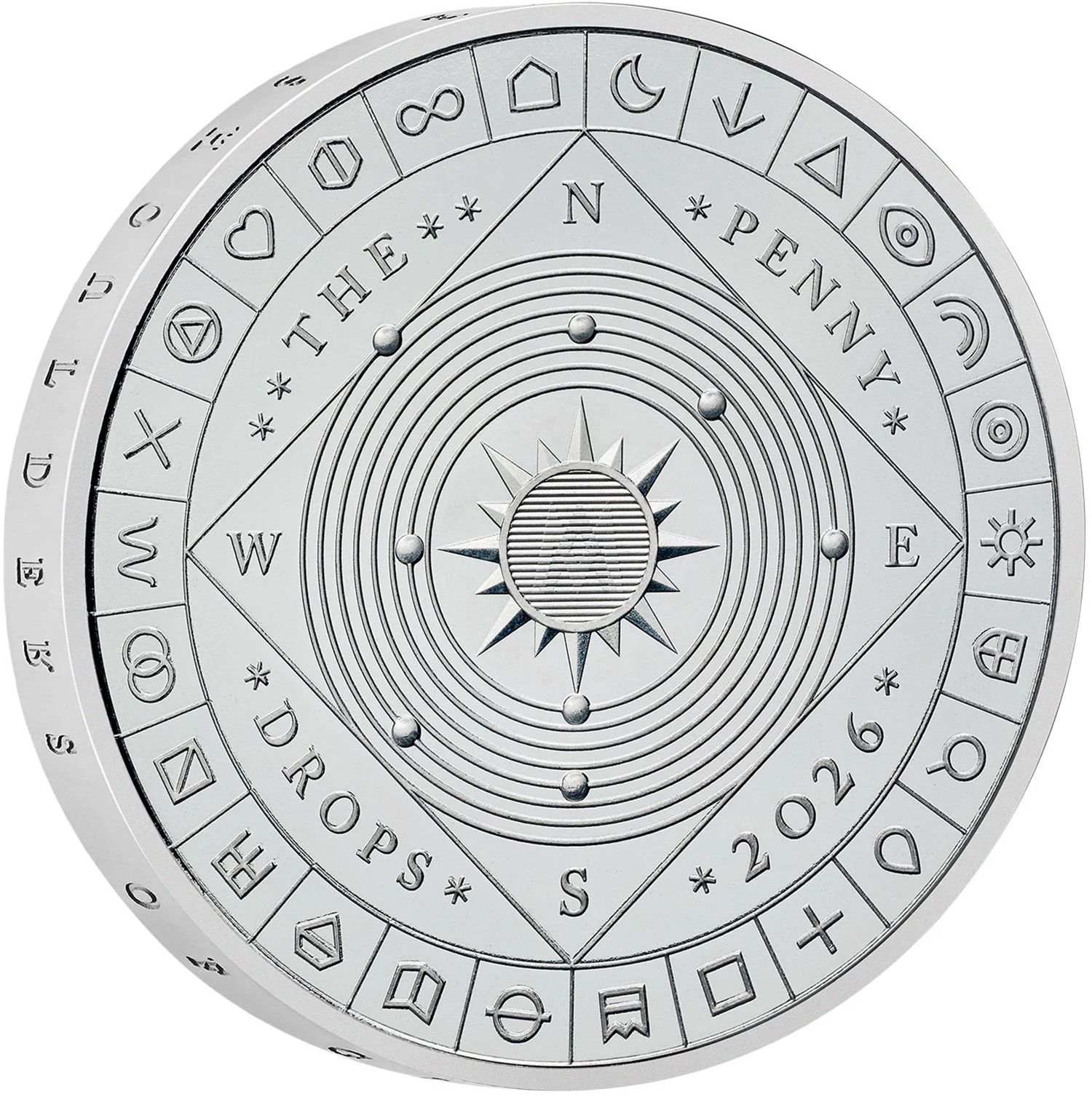 Опис: Зображення чотирьох сторін світу та карти планет навколо Сонця з прихованим елементом, оточене кільцем із 26 символів, супроводжуване написом