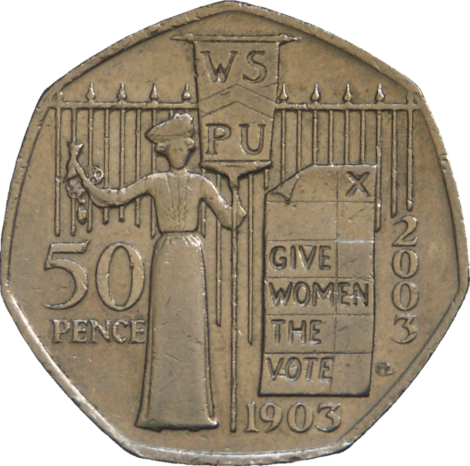 Опис: Фігура суфражистки, прикута ланцюгом до перил і тримає прапор, на якому зображені літери WSPU; праворуч — виборчий бюлетень, позначений хрестиком і словами GIVE WOMEN THE VOTE; ліворуч — номінал 50 PENCE; а внизу та вкрай праворуч — ювілейні дати 1903 та 2003