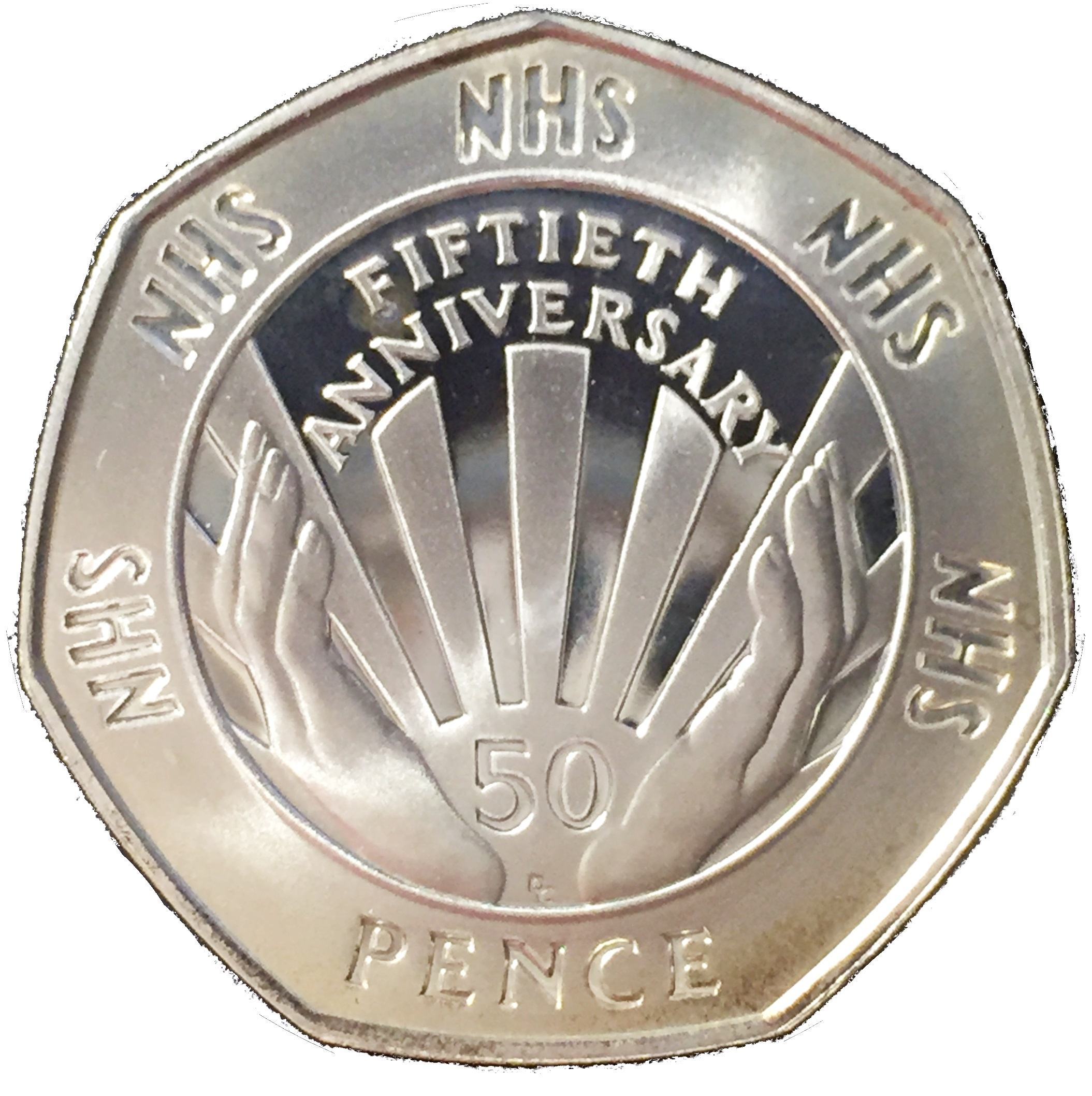 50 пенсів — Єлизавета II (50-річчя NHS; срібна монета Proof)