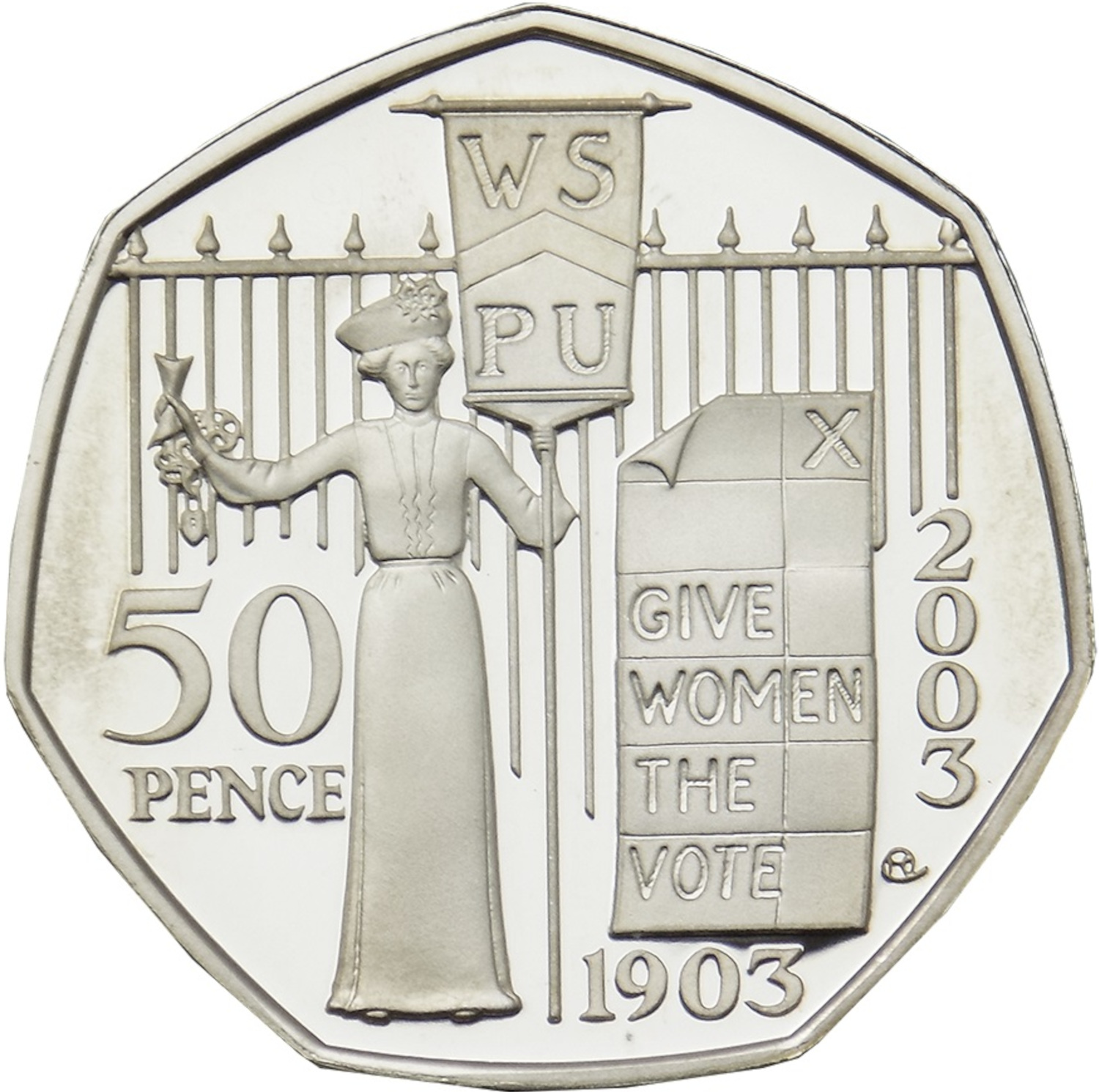Опис: Фігура суфражистки, прикута ланцюгом до перил і тримає прапор, на якому зображені літери WSPU; праворуч — виборчий бюлетень, позначений хрестиком і словами GIVE WOMEN THE VOTE; ліворуч — номінал 50 PENCE; а внизу та вкрай праворуч — ювілейні дати 1903 та 2003.