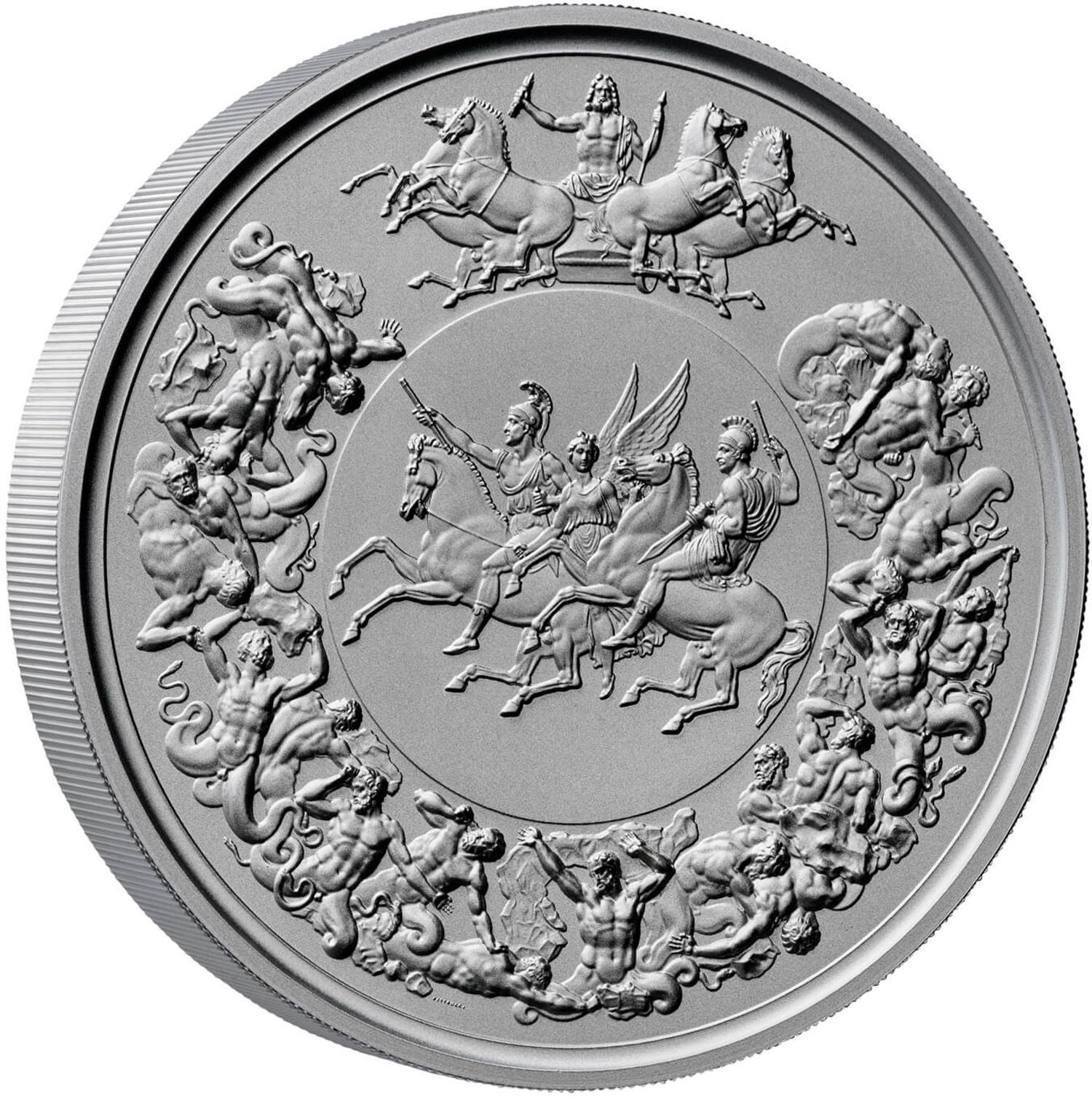 Опис: Зображення герцога Веллінгтона та прусського полководця Герхарда фон Блюхера, представлених у вигляді двох вершників у супроводі Ніки, богині перемоги, та колісниці Зевса, оточених фігурами чоловіків із зміїними ногами