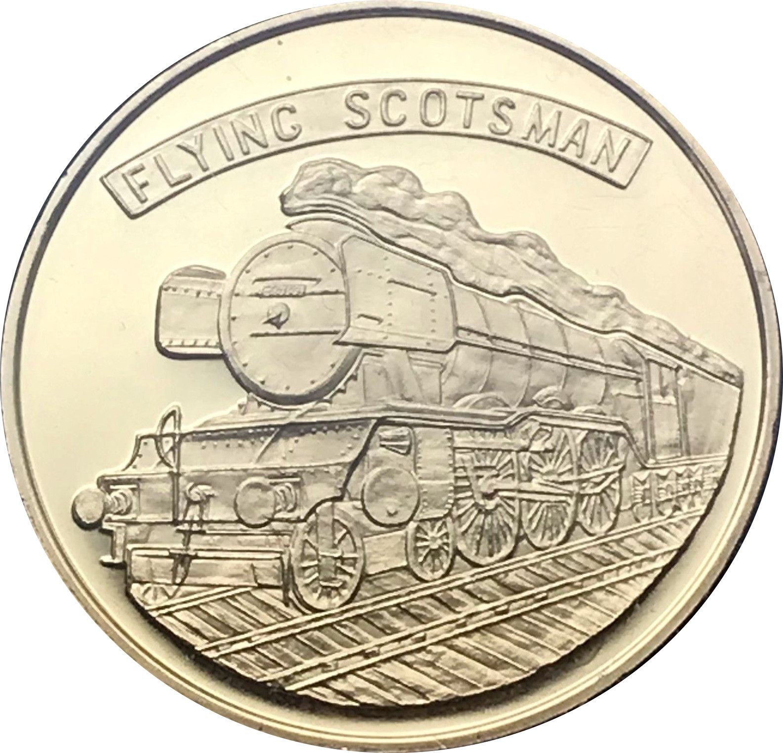 Опис: Локомотив A3 Class Pacific Flying Scotsman, спрямований вліво на рейках, з димом, що виходить з димаря. Іменна табличка над медаллю, а також у вітрині, з написом під медаллю, золотими літерами на чорному тлі.