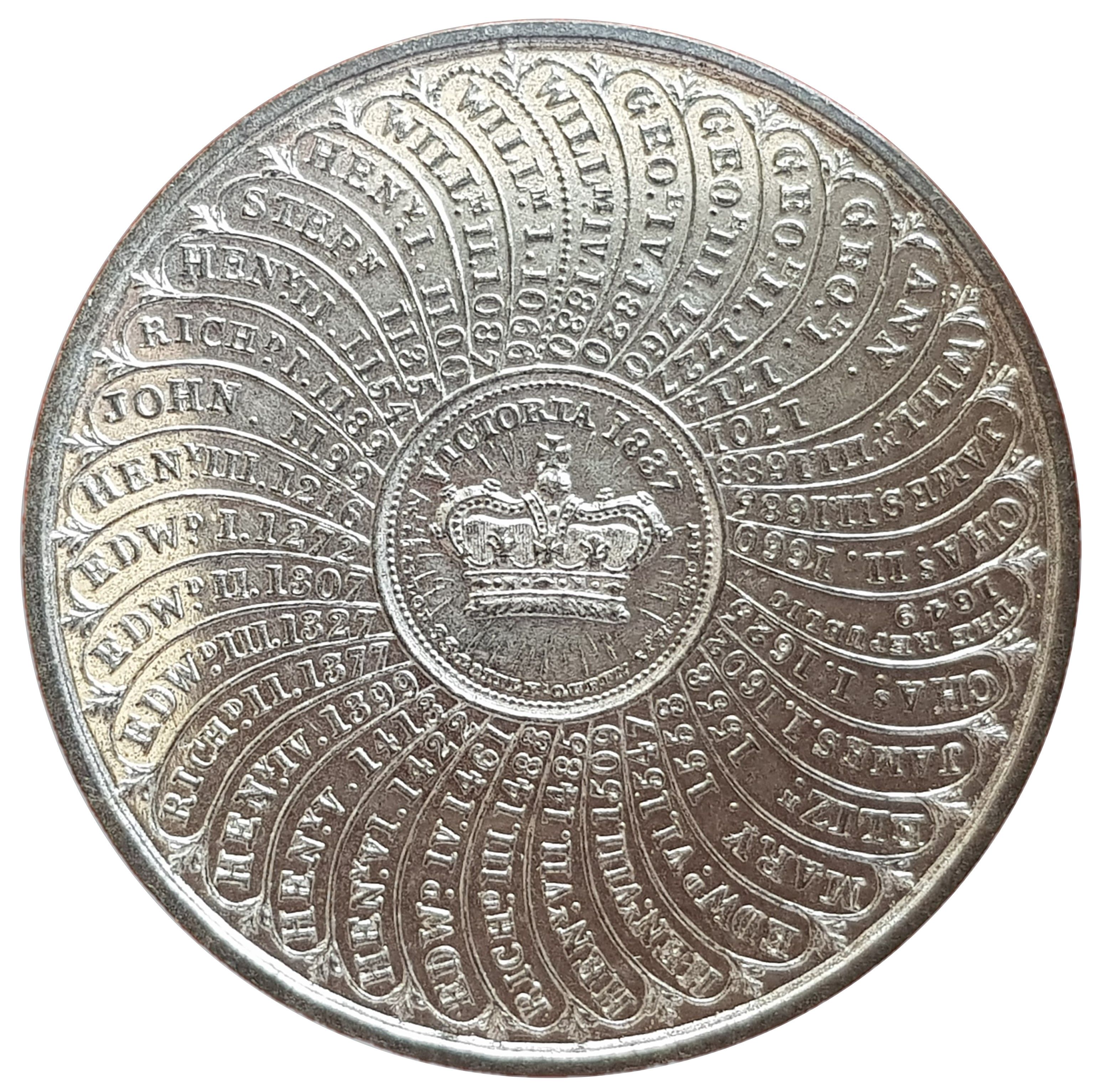 Опис: Центральна корона, оточена легендою, виробником, місцем розташування та намистиновим колом. У свою чергу, оточена ілюстрованим історичним списком «королів» з 1066 по 1830 рік.