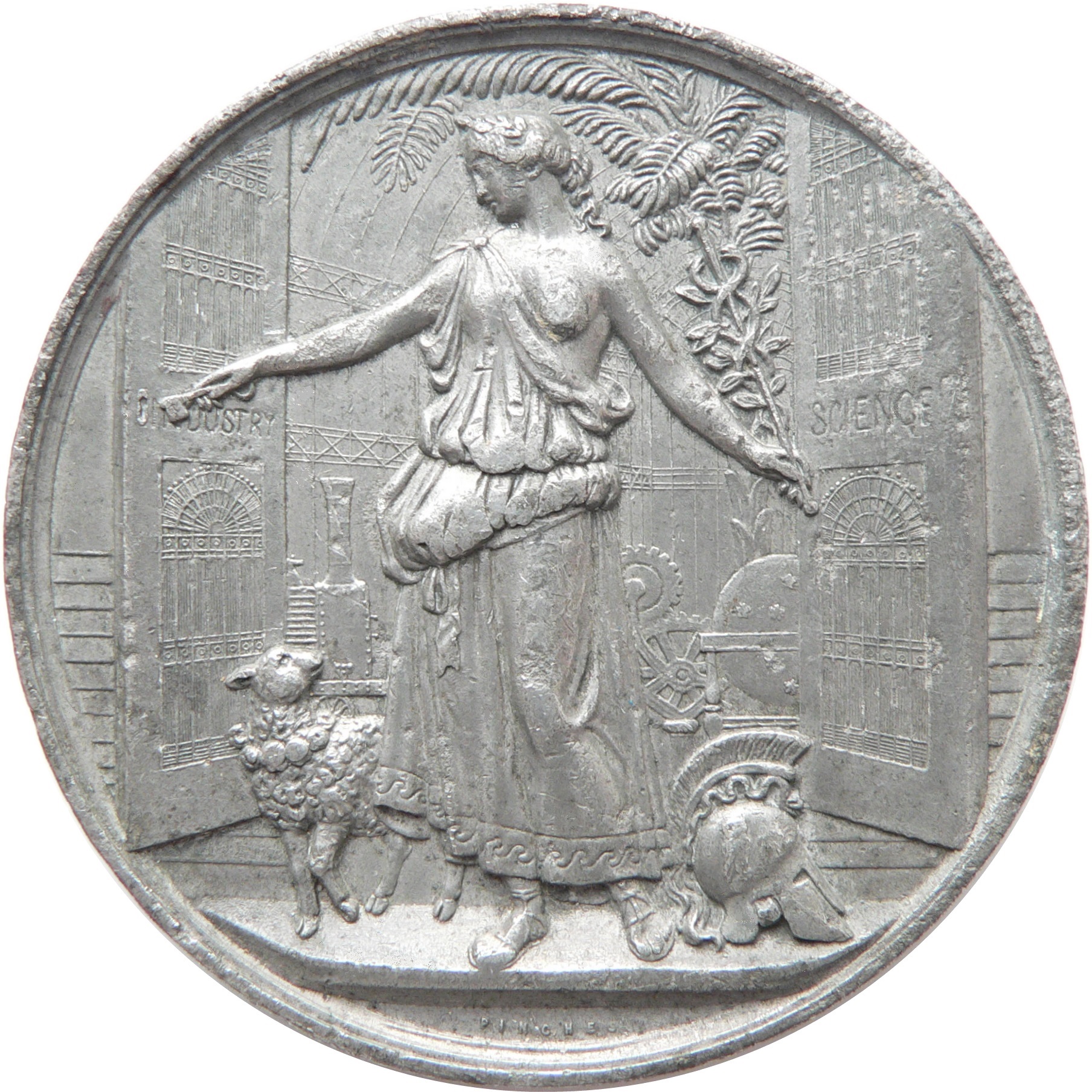 Опис: Частково одягнена класична жінка стоїть напівбоком між двома воротами, а біля її ніг лежить ягня (у вінку), яке дивиться на неї. У лівій руці вона тримає пальмову гілку та кадуцей, а в правій — ключ. Біля її лівої ноги лежить старовинний гребінчастий бойовий шолом. Відкриті ворота відкривають вид на кімнату з різним науковим та промисловим обладнанням і пальмою.