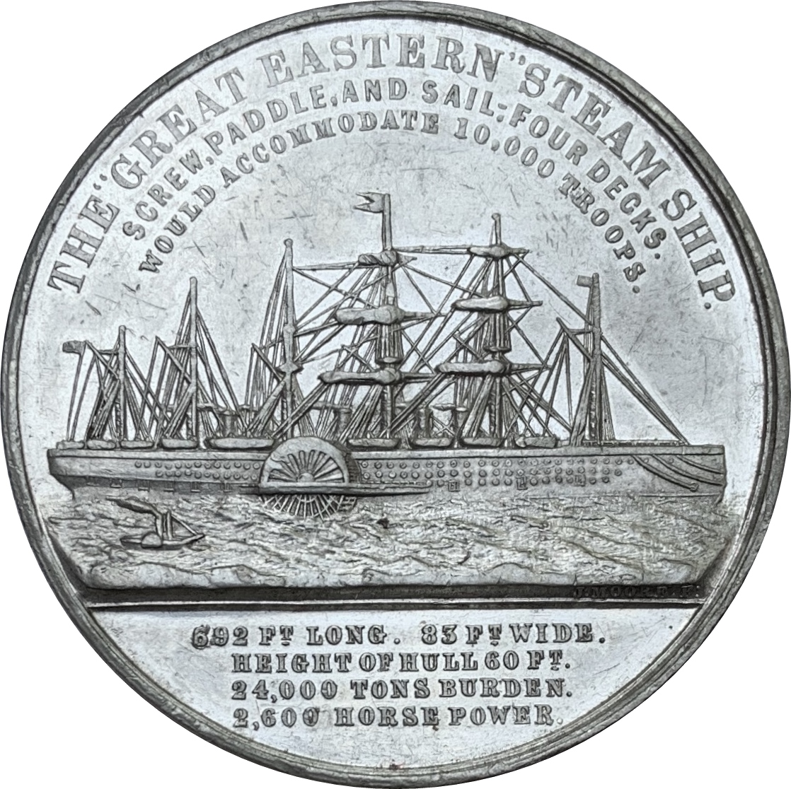 692 Ft LONG. 83 Ft WIDE. // HEIGHT OF HULL 60 Ft. // 24,000 TONS BURDEN. // 2,600 HORSE POWER.