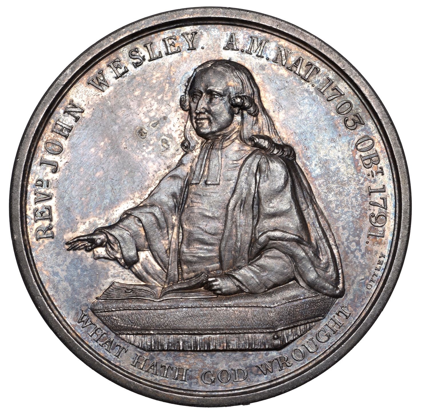 Опис: Драпірований бюст Джона Веслі, три чверті ліворуч, проповідує з амвона.