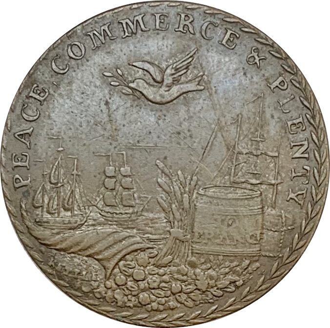 Опис: Розсипаний ріг достатку, бочка з написом TO FRANCE (праворуч), голуб миру зверху; два кораблі під вітрилами вдалині (ліворуч і в центрі), один на якорі (праворуч). Напис зверху, суцільна облямівка з лаврового вінка. Підпис KETTLE під рогом достатку.