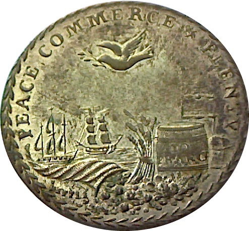 Опис: Розсипаний ріг достатку, бочка з написом TO FRANCE (праворуч), голуб миру зверху; два кораблі під вітрилами вдалині (ліворуч і в центрі), один на якорі (праворуч). Напис зверху, суцільна облямівка з лаврового вінка. Підписом KETTLE під рогом достатку.