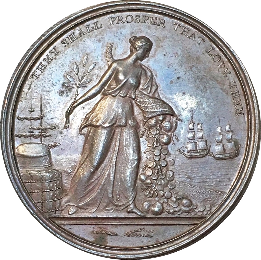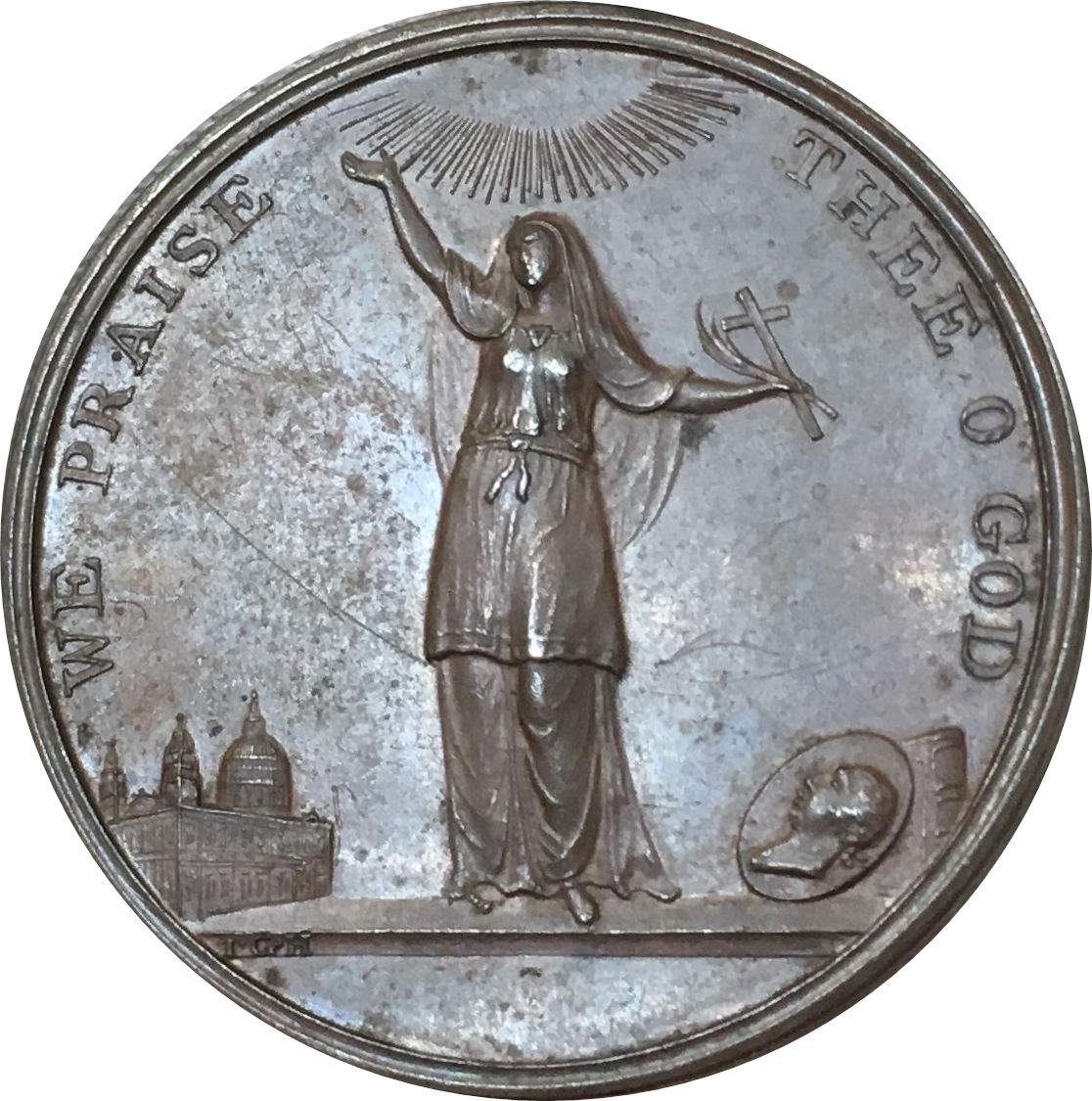 Опис: Жінка, що тримає хрест, стоїть, над нею сонячні промені. Будівля внизу ліворуч, бюст Георга III внизу праворуч. Ексерг порожній.